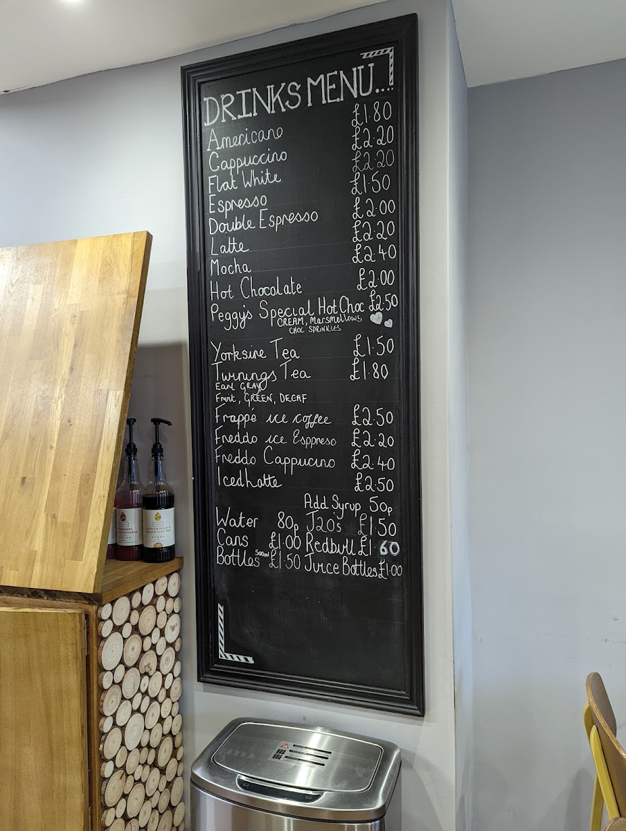 Drinks include a range of hot and cold beverages such as cappuccino, flat white, espresso, double espresso, latte, mocha, hot chocolate, and tea including Yorkshire Tea. Specialty drinks like Peggy's Special and Freddo Cappuccino are also available, alongside bottled water and canned drinks.