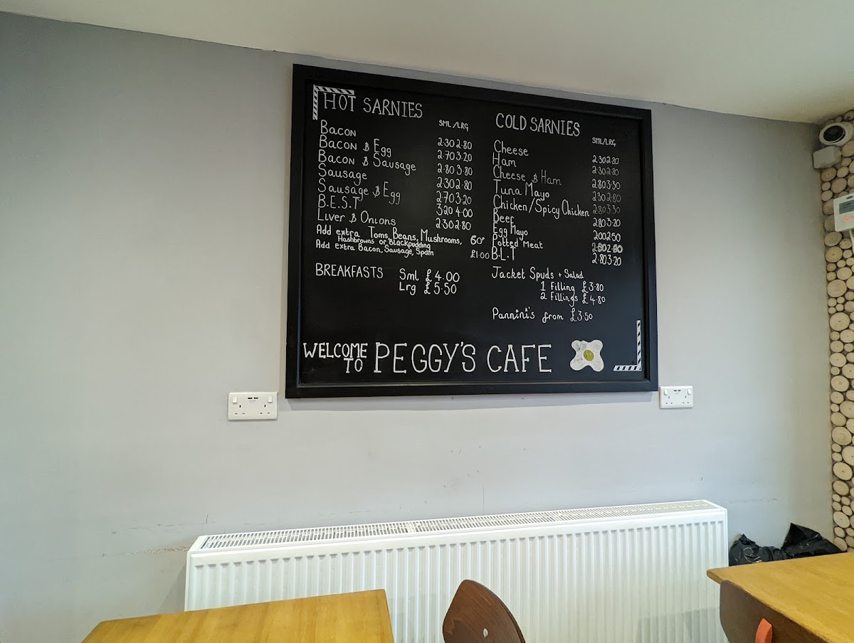 The menu at Peggy's Cafe offers a variety of options suitable for breakfast, coffee breaks, and light meals. It is organized into clearly defined groups, making it easy for visitors to navigate and select items according to their preferences.